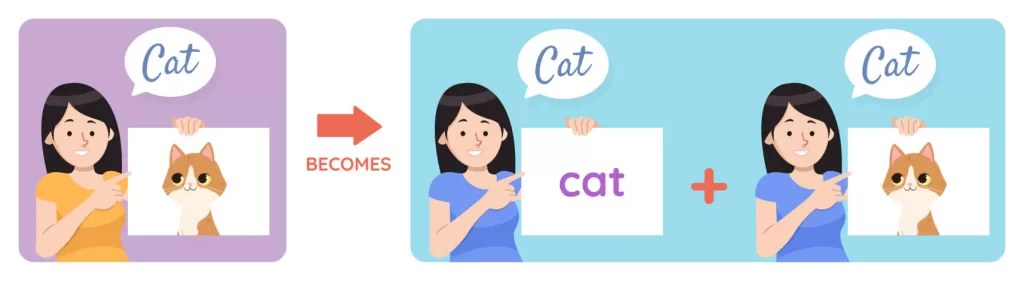 Let’s take an example. When we show pictures of a cat, sounding out ‘cat’ will let babies associate the visual image of a cat with the sound, ‘cat’. However, by also showing the word ‘cat’ and sounding out ‘cat’ at the same time, babies will start to associate all three (the image, sound, and word) together, and understand that the furry creature they see is called ‘cat’, and can be represented in written form as ‘cat’.
